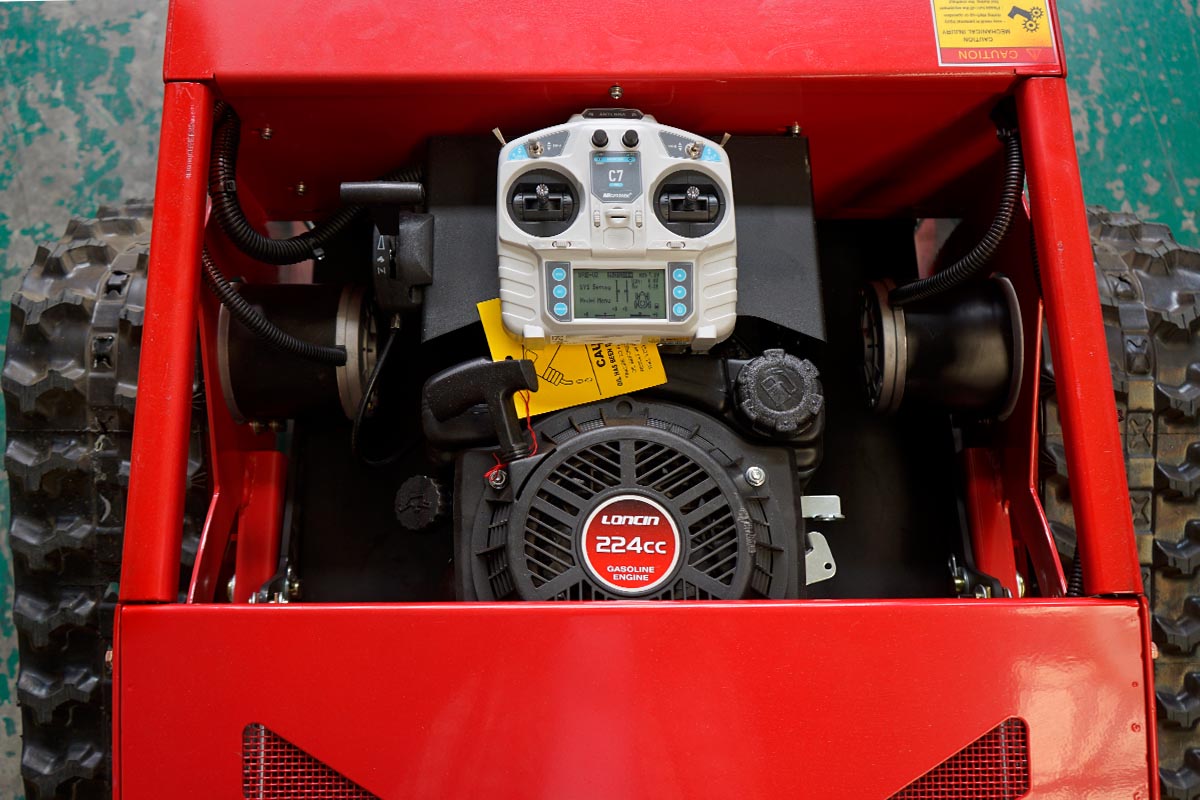 GC-L224-55A is designed for multi-scenario mowing needs, it is a “small mower” for complex terrain. 136kg weight with 930mm×900mm×570mm compact body, flexible and stable. Equipped with Loncin four-stroke engine, power 9.0ps, electric crawler self-propelled design, with 55cm mowing width and 10mm-180mm adjustable height of the cutting platform, supporting 200m remote control operation, whether it's barren grass, slopes, or orchards, nurseries, can easily and efficiently complete the mowing operation.